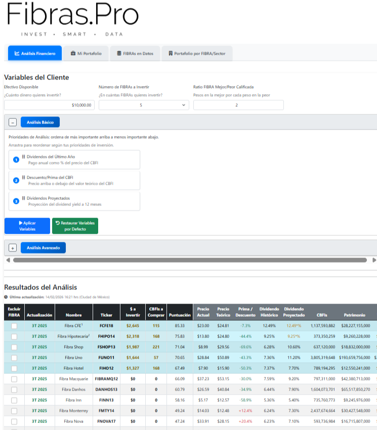 No. Fibras.Pro es una herramienta cuantitativa de análisis. La información generada no constituye asesoría ni recomendación personalizada de inversión. Las decisiones son siempre tuyas.
