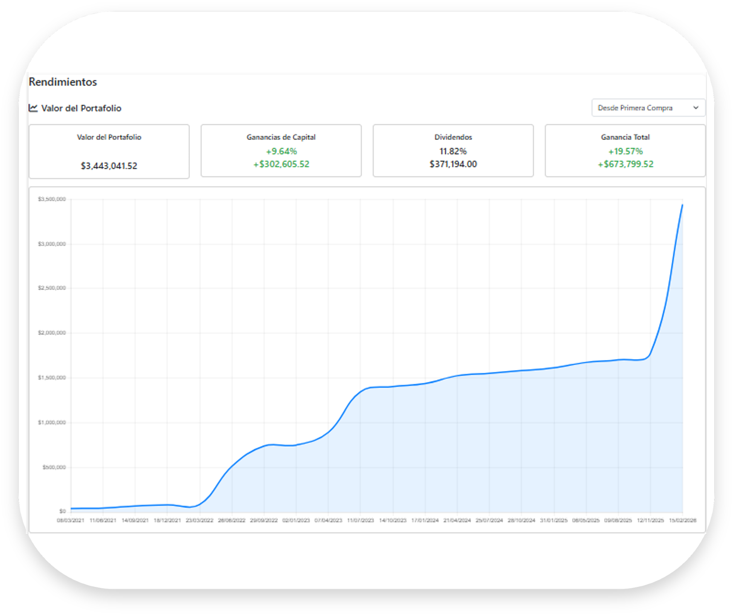 Rendimiento: valor total del portafolio, ganancias de capital, distribuciones acumuladas, rendimiento total y evolución histórica.