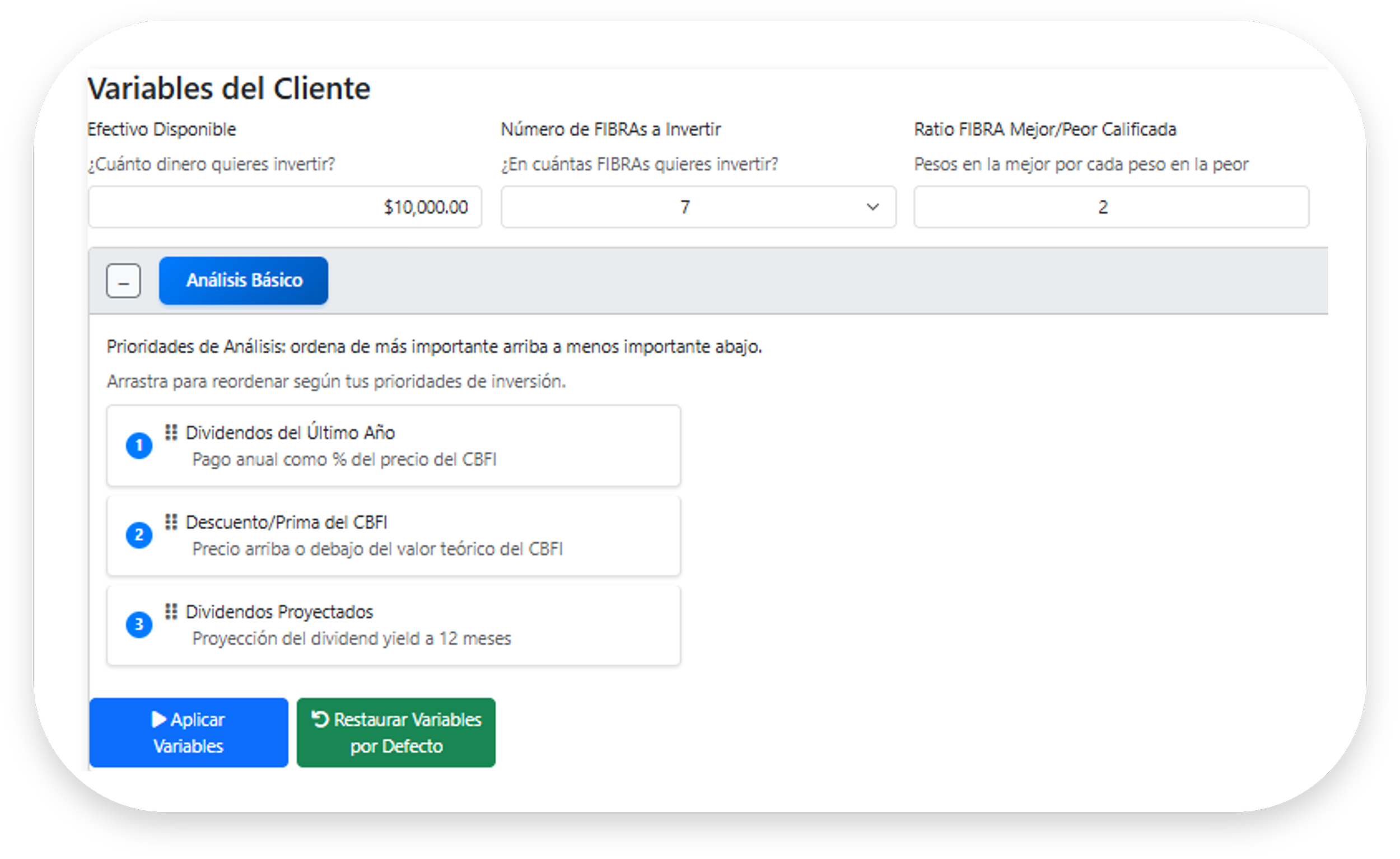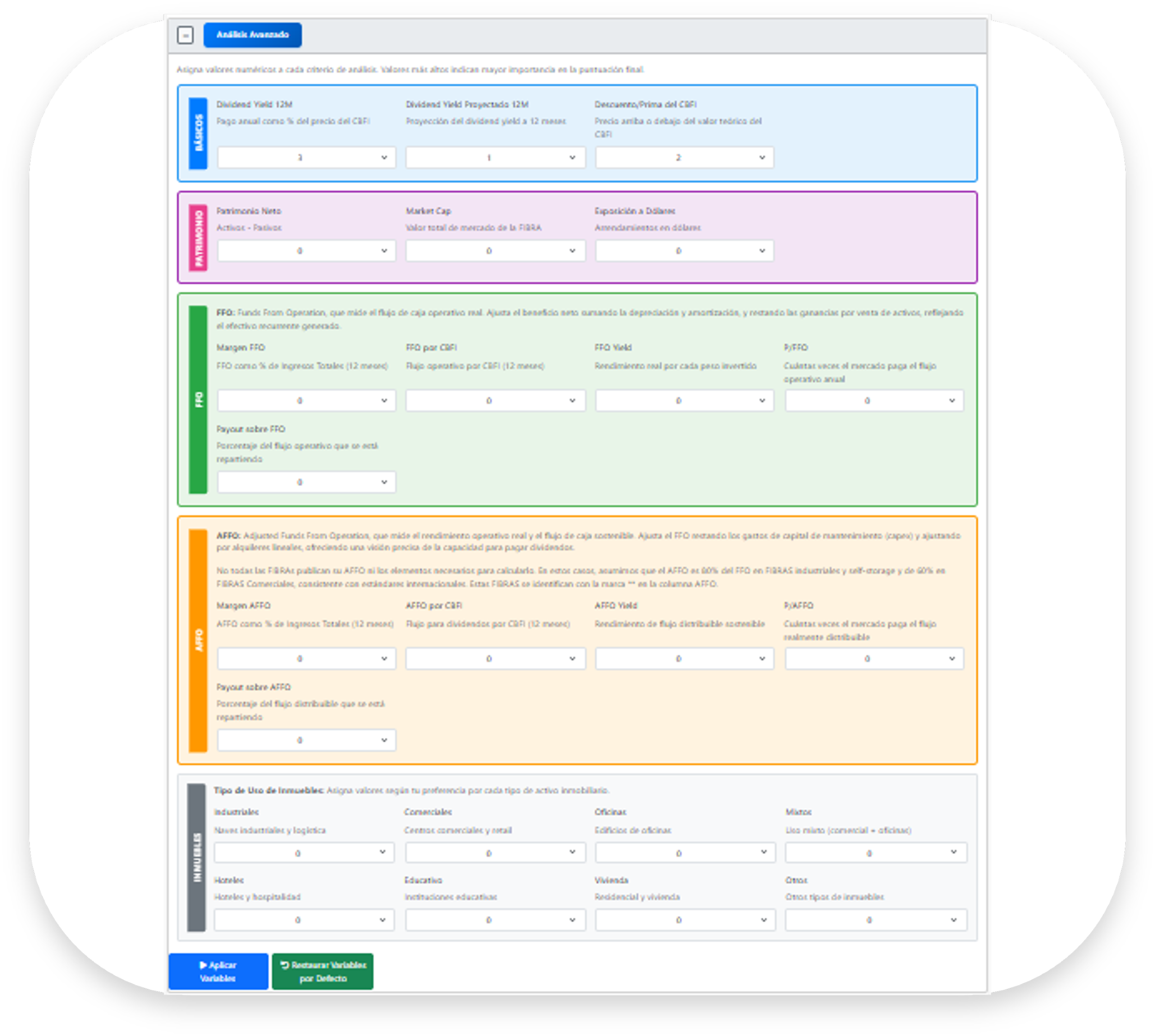 Análisis avanzado: asigna ponderaciones numéricas precisas a criterios avanzados que incluyen, además de los criterios del anaisis básico, FFO y AFFO*, márgenes operativos, payout ratio, capitalización de mercado, patrimonio neto y valuaciones relativas (P/FFO, P/AFFO).