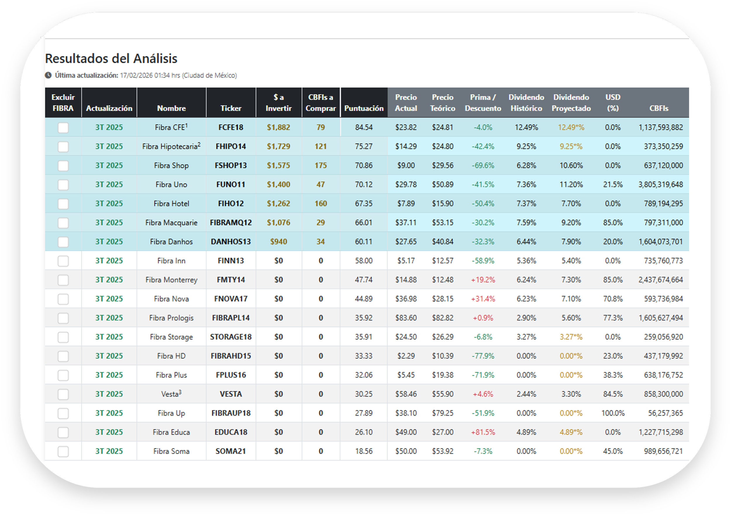 Un modelo cuantitativo para tomar decisiones de inversión en FIBRAs, FIBRAs-E y empresas inmobiliarias listadas, con criterios estructurados — y dar seguimiento a tu portafolio en el tiempo.